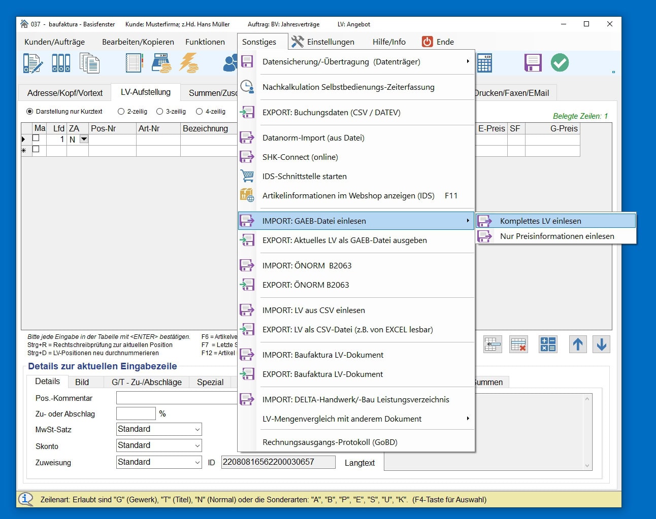 - Das leere LV öffnet sich und in der Standardeinstellung von baufaktura befinden Sie sich bereits auf dem Reiter “LV-Aufstellung”. Klicken Sie als nächstes oben im Menü auf “Sonstiges”, “IMPORT GAEB-Datei einlesen” und “Komplettes LV einlesen”.