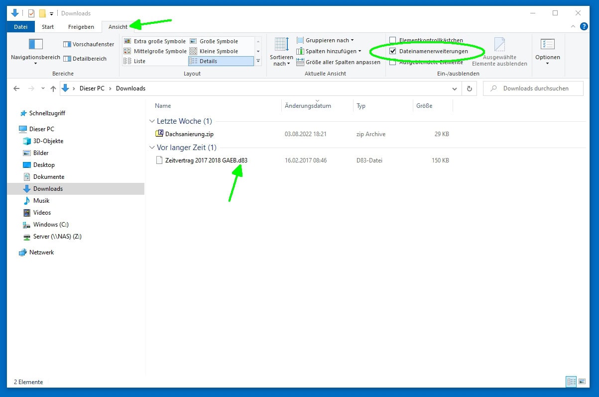 🔹 Tipp: Falls Sie die Endung nicht sehen, aktivieren Sie im Explorer unter „Ansicht“ → „Dateinamenerweiterungen“.