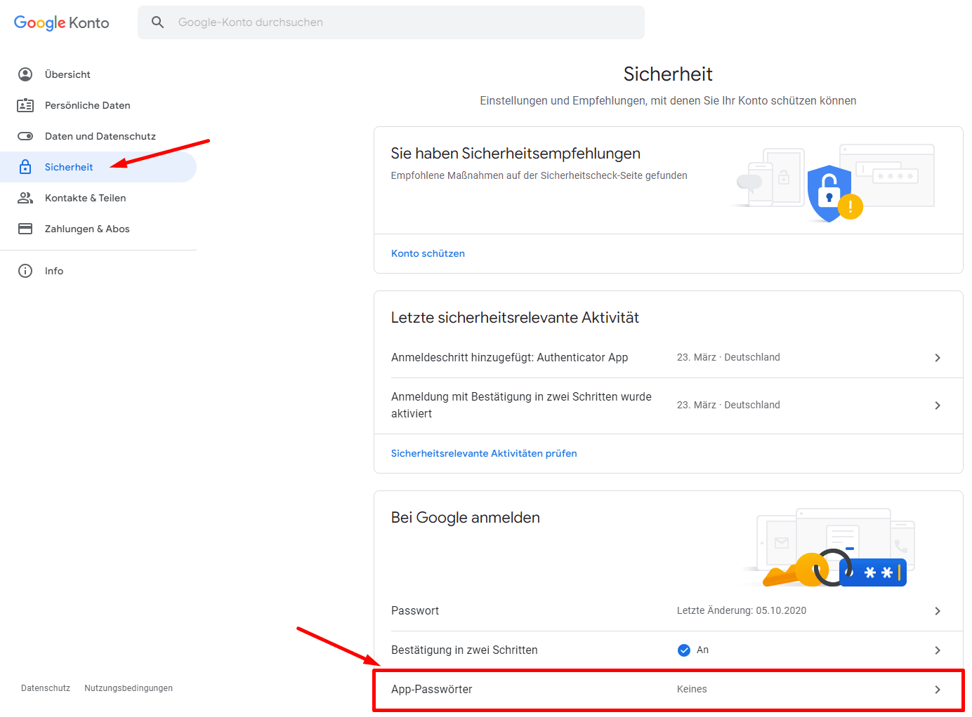 Klicken Sie in der rechten oberen Ecke auf ihr Logo und in dem kleinen neu geöffneten Fenster auf Google-Konto verwalten. Alternativ erreichen Sie die Seite auch über folgenden Link: https://myaccount.google.com