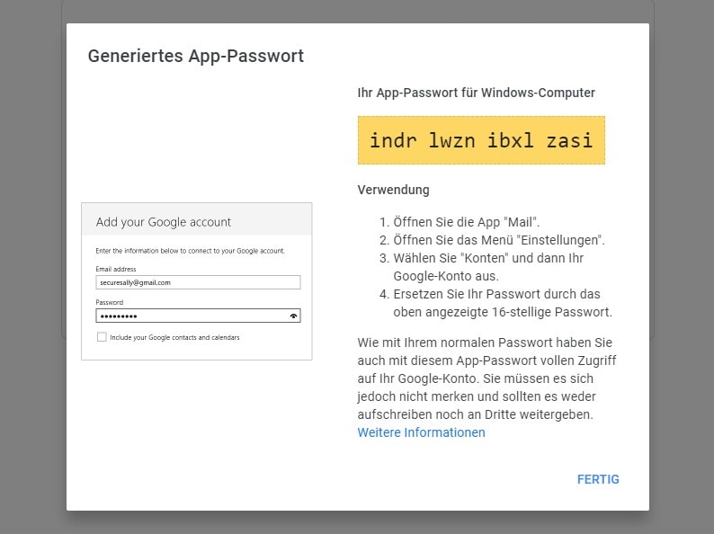Das App-Passwort wurde nun generiert. Sie sehen es in dem gelben Kasten.