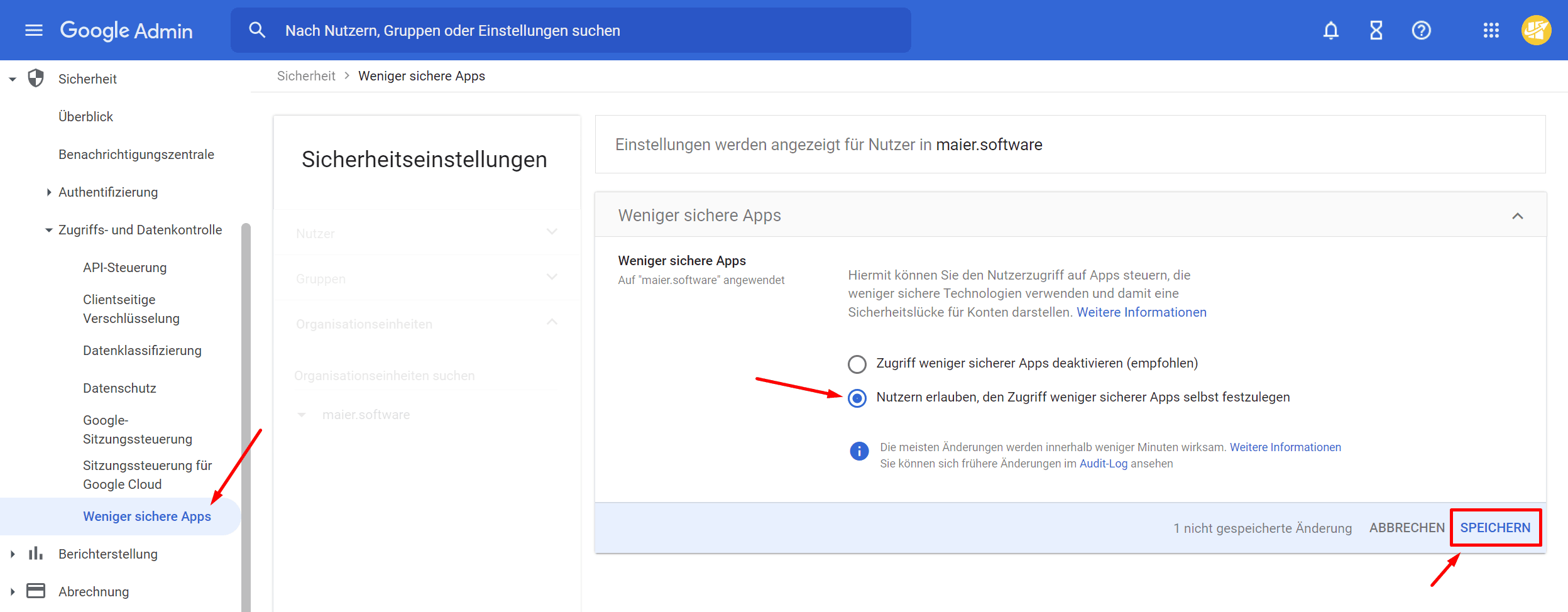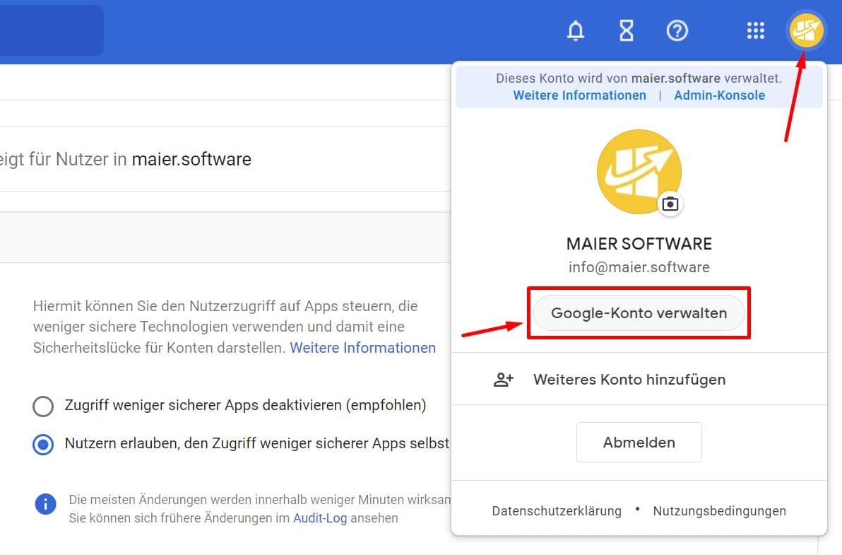 In den Sicherheitseinstellungen ist der Button “Nutzern erlauben, den Zugriff weniger sicherer Apps selbst festzulegen” zu aktivieren.