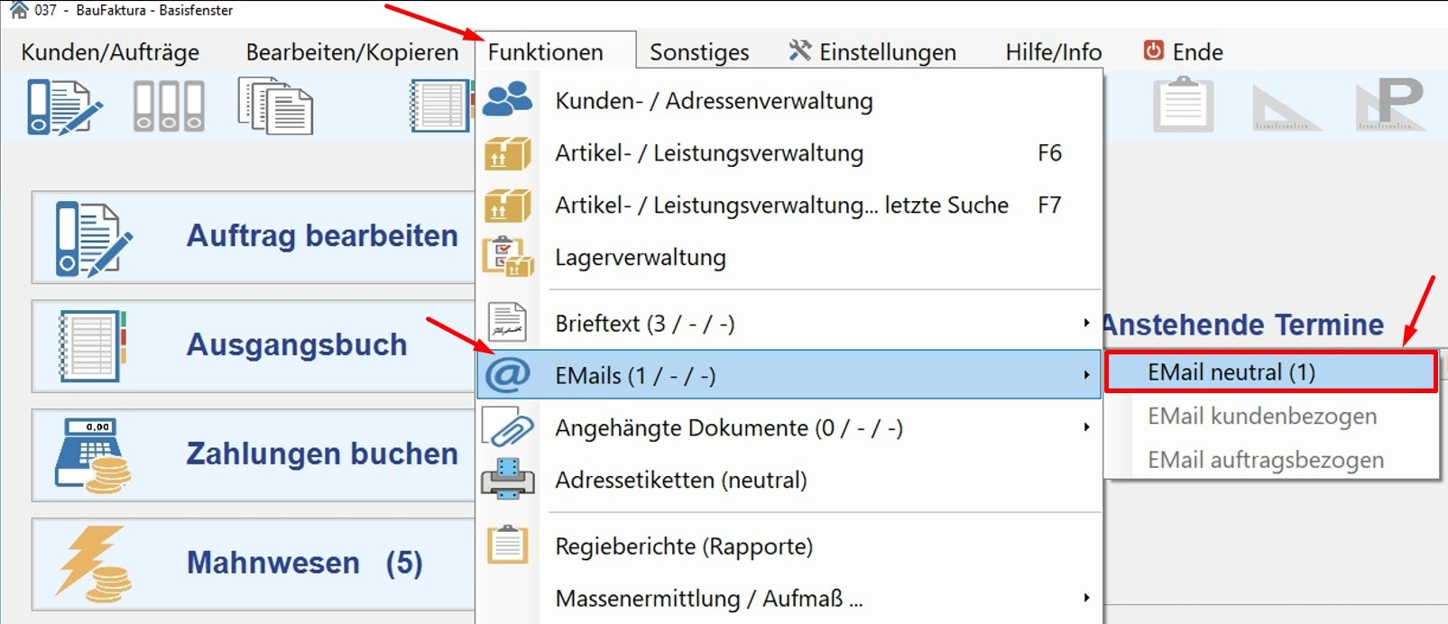 Im letzten Schritt hinterlegen wir die neuen Zugangsdaten in baufaktura. Starten Sie dazu das Programm baufaktura. Im Fenster 037 klicken Sie im Menü unter Funktionen > EMails auf den Punkt EMail neutral.