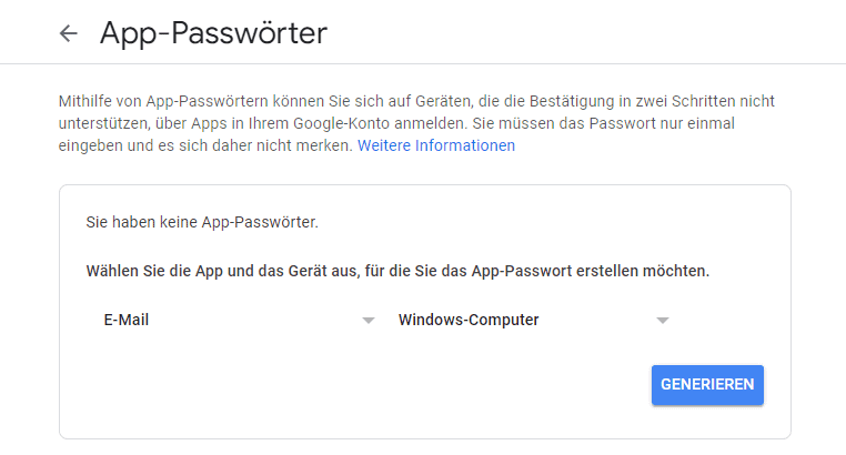 Nun gibt es viele Programme von Drittanbietern die OAuth nicht unterstützen. Deshalb hat Google eine Alternative entwickelt hat, um die Sicherheit trotzdem zu gewährleisten. Diese Möglichkeit schauen wir uns im nächsten Schritt an.